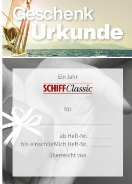 Mit dem SCHIFFClassic- Magazin verschenken Sie pure Leidenschaft für Schifffahrts- und Marinegeschichte. Sie können sich sofort eine Geschenkurkunde ausdrucken und dem Beschenkten überreichen, den Rest übernehmen wir. Dazu erhalten Sie eine hochwertige Dankeschön-Prämie zum Behalten oder Verschenken. Kein Risiko - das Geschenkabonnement endet automatisch.