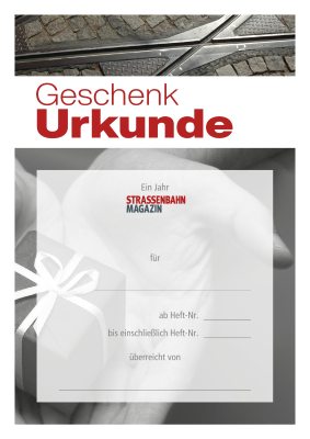 Überraschen Sie einen lieben Menschen mit einem Geschenkabo des Strassenbahn Magazins. Wählen Sie zwischen verschiedenen Abo-Optionen und schenken Sie spannende Einblicke in die Welt der Straßenbahnen inklusive einer tollen Prämie.