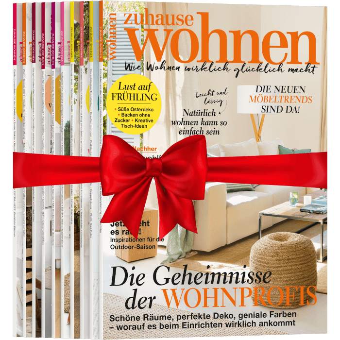 Mit einem Geschenkabonnement verschenken Sie ein Jahr (10 Ausgaben) das Magazin zuhause wohnen. Sie können sich sofort eine Geschenkurkunde ausdrucken und dem Beschenkten überreichen, den Rest übernehmen wir. Dazu erhalten Sie eine hochwertige Dankeschön-Prämie zum Behalten oder Verschenken. Kein Risiko - das Geschenkabonnement endet automatisch.